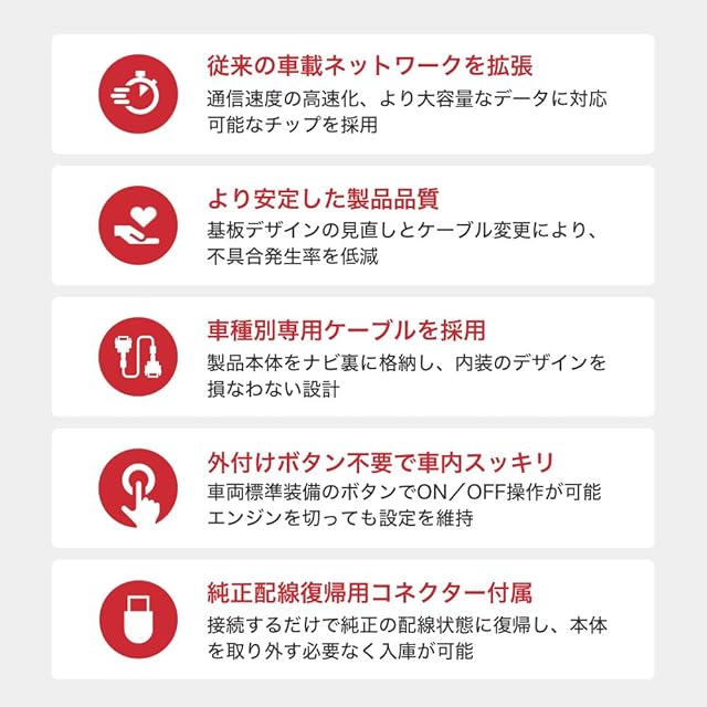【ご注意】 取り付けには内装パーツの脱着が必要です。作業に不安のある方は弊社または専門店にご相談ください。取り付けに必要な工具は付属しません。取り付けには別途工具が必要となります。ディーラーなどに入庫の際は、機能をオフにすることをおすすめいたします。