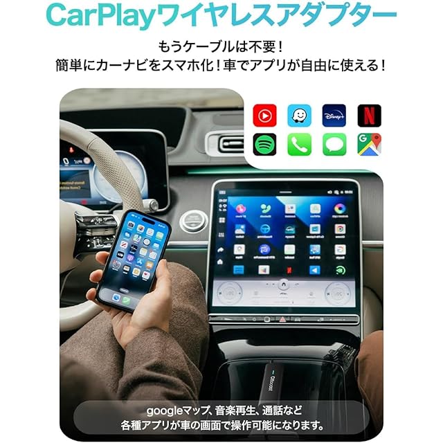 【CarPlayを有線から無線に転換】本製品を差し込むだけで、簡単に純正ディスプレイにお好きなアプリを表示させることができます。googleマップ、音楽再生、通話など各種アプリが車の画面で操作可能になります。