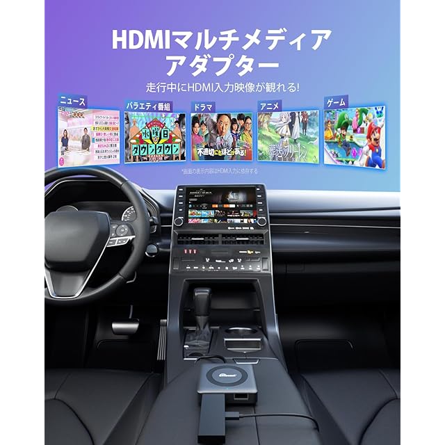 【かんたんセットアップ】①本体を車のUSBポートに接続②TV stickなどのHDMI デバイスを本体に接続 ③HDMIデバイスは別途で電源を供給する必要があります。④本製品を接続した後、ホーム画面で「HDMI」をタップし、HDMIデバイスを本製品のHDMIポートに接続してください。お使いのスマートフォンのホットスポット機能を利用して、Fire TV Stickなどのコンテンツにインターネット接続を共有することで、車内でHDMI入力映像を視聴できます。また、車載Wi-Fiを使用することも可能です。※本製品はスマートフォンのテザリング機能を直接使用することはできませんので、ご了承ください。