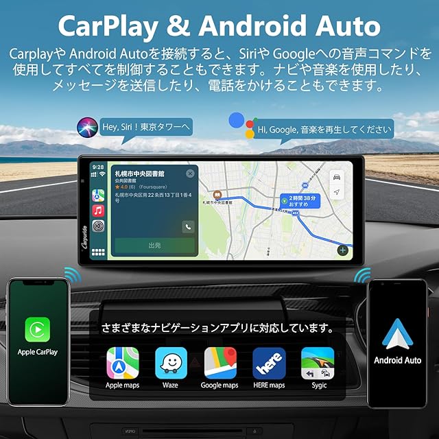「スマート音声コントロール機能付く」カーナビ はスマートフォンの AI アシスタントを使用して、道路から目を離さずに電話をかけたり、メッセージの送受信をしたり、お気に入りの音楽を再生したりできます。 運転中にスマートフォンを使用する場合は停車時に操作をする必要がありません、Siri または Google を声だけでレシーバーを制御することもできます。