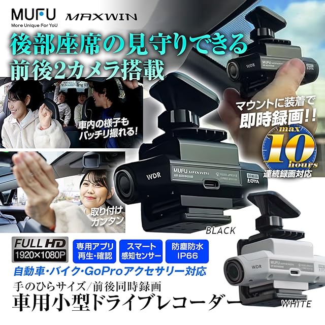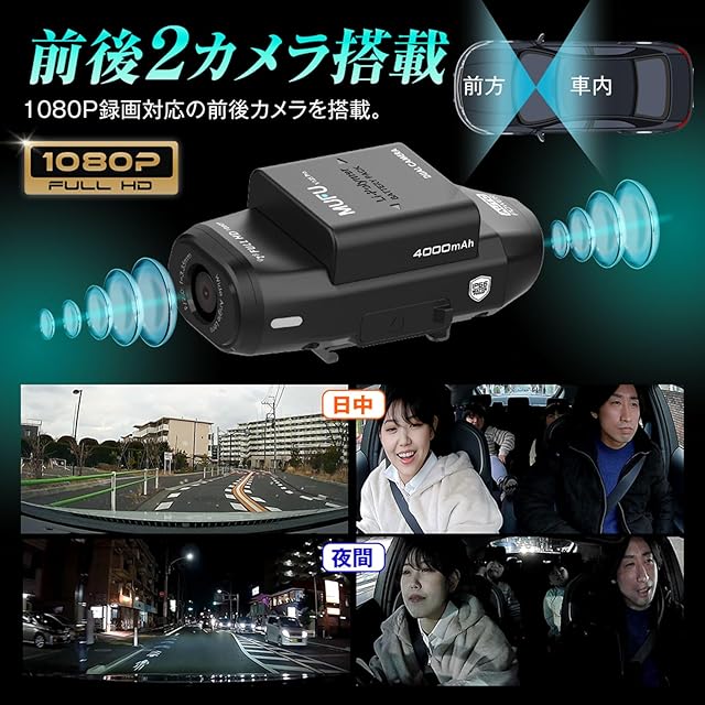 ドライブレコーダー 車載 2カメラ録画 自動車 装着即時録画 WiFi 200万画素 フルHD 4000mAhバッテリー内蔵 スマート感知センサー MUFU ブラック MF-BDVR004B車用セット