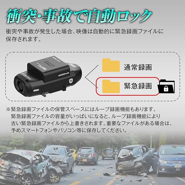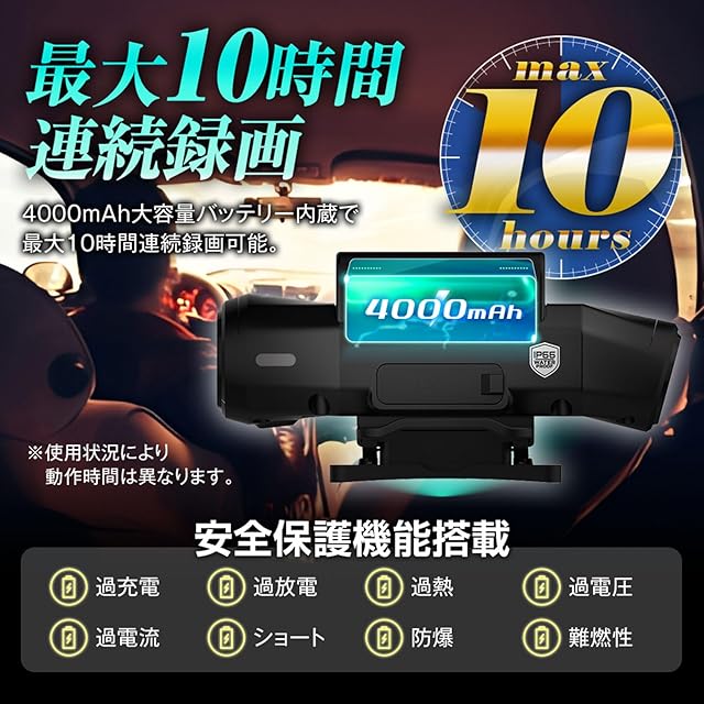 【配線不要!装着すると即時録画の前後2カメラ搭載 車内録画も可能なドライブレコーダー】4000mAh大容量バッテリー内蔵で最大10時間連続録画可能。200万画素カメラでFull HD高画質録画、全国のLED信号機にも対応。 「スマート感知センサー」で、カメラ本体の着脱で、自動で電源オン/オフ。手のひらサイズなので、持ち運びにも便利。フロントカメラ・車内カメラとして使用可能。