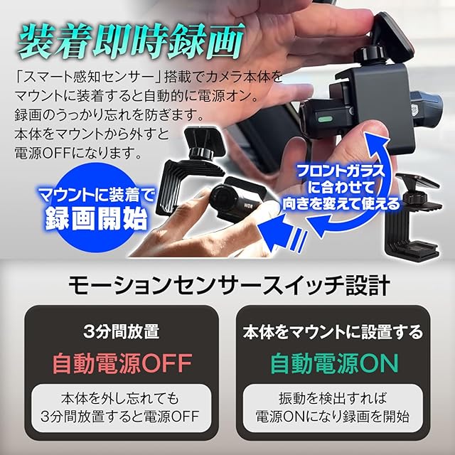 【C型マウント付属の車用セットなら前方・車内を同時録画】カメラ本体をC型マウントに装着すると自動的に電源ON、マウントに装着するだけで録画開始。前方・車内を同時に録画ができます。事故・あおり運転などでドライブレコーダーが必要となる瞬間は、車外だけではありません。車内の状況を記録できることで現場検証・証拠映像として役に立ちます。