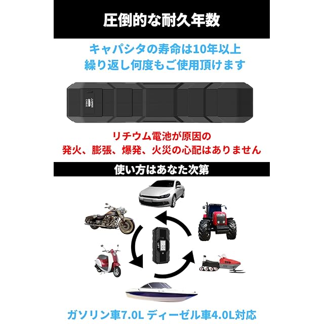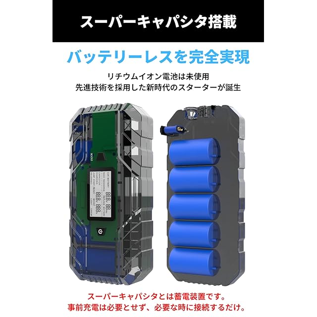 【最先端技術スーパーキャパシタ搭載】リチウム電池未使用の画期的な新技術であるスーパーキャパシタを搭載。従来のジャンプスターターとは異なり、事前充電は不要でバッテリー上がりの車から電力を蓄え増幅してエンジン始動を行います。
