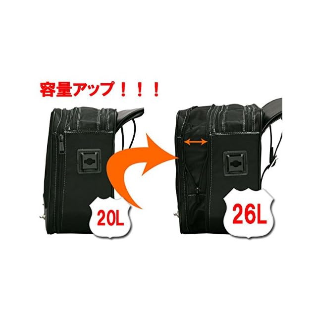 色[カラー]:ブラック <br> 材質[素材]:PVC(合成皮革)・ナイロン <br> サイズ:縦32x横42x幅15~20(cm) <br> 付属品:取り付けベルト・レインカバー <br> 容量[リッター]:20~26L