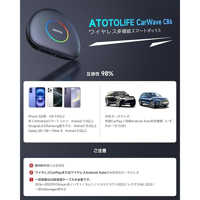 ワイヤレス接続を楽しむ:CarWave CB6(別名: ATOTOLIFE CB6C)は、有線CarPlay/Android Autoをワイヤレスに変換するMultifunction Car Smart Boxです。車載ディスプレイが有線対応のみでも、Wireless CarPlay Android AI Boxとして即座にアップグレード可能。「車でYouTube見る 方法」でお困りの方にも最適なAIボックスです