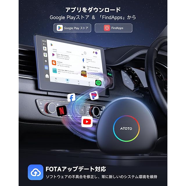 拡張機能が豊富:プリインストールアプリ(DriveChat音声アシスタント等)に加え、AI ボックス専用APKダウンローダー「FindApps」でG00gle Play未対応アプリも追加可能。FOTA更新で最新機能を継続提供します。車内エンタメを充実させたい人にはめっちゃおすすめです