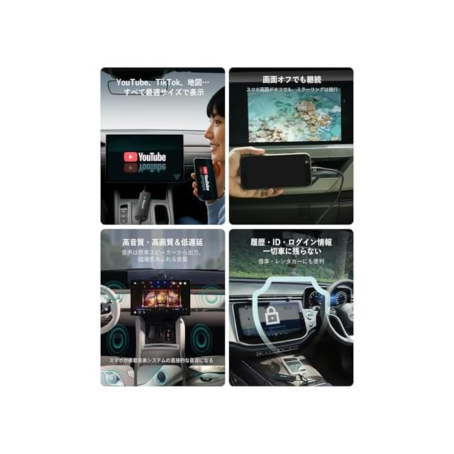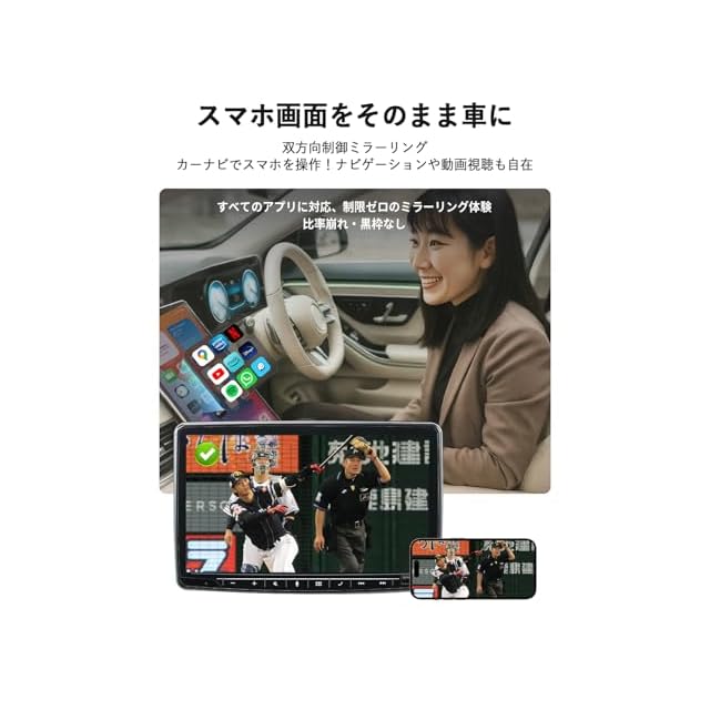 【遅延ほぼゼロ、スマホ操作そのままの快適さ】カーナビ画面でのスワイプ・スクロール・タップは、まるで普段のスマホを使っているかのようなスムーズさ!地図も映像も、切れ目や黒帯なしのフルスクリーンで迫力満点の大画面体験を楽しめます。(※対応機種:iPhone 15以降のモデルおよびDP Alt Mode対応のAndroidスマホ)。
