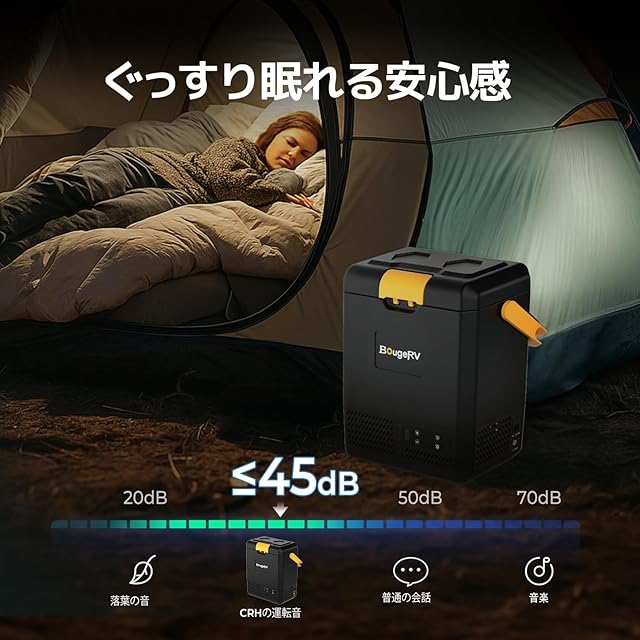 【専用アプリで快適操作&LEDコントロールパネル】 BougeRV専用アプリを使えば、冷蔵庫の温度や設定をスマートフォンから簡単に操作できます。本体に近づく必要がなく、テントや車内からでも手軽に管理可能。最大10mの範囲で操作できるため、アウトドアシーンや車中泊でも快適に使用できます。さらに、シンプルで分かりやすいLEDコントロールパネルを採用。温度設定や動作状況が一目で確認できるため、初めて使う方でも迷わず操作できる直感的なデザインです。
