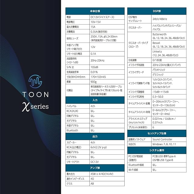 本体仕様:電源:DC12V(マイナスアース)/電源電圧:10V-15V/最大消費電流:15A/消費電流:0.35A(無信号時)/使用ヒューズ:250V、15A、φ5.2×30mm(車両接続用ケーブルに付随)/外部アンプ用リモート端子出力:12V/リモート出力電流:0.1A/周波数特性(+0/-1dB):20Hz-22kHz/S/N比:105dB/全高調波歪率:0.01%/寸法(W×D×H)mm:170×103×45/質量:900g