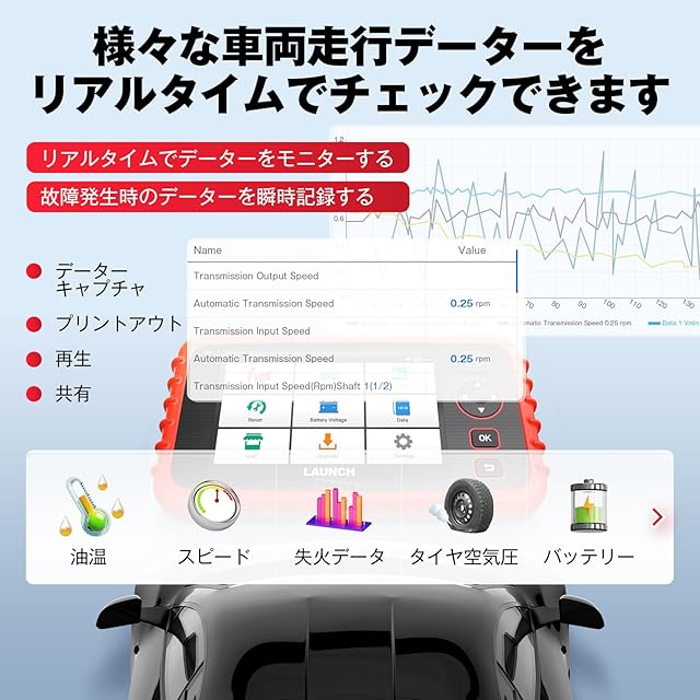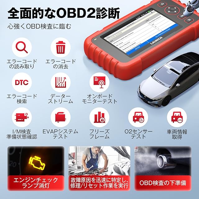 【全OBD2検査項目】LAUNCH CRP129X Plus OBD2診断機は全項目のOBDテスターでもあり、エンジン失火、燃料システム、O2センサー、A/Cシステム、EVAPシステムなどの故障コードの読み取り/消去、ライブデーターのモニター、フリーズフレームの取得などができます。事前にこの診断機を使ってOBD検査の各項目を事前にチェックし、故障コードなどを対応してから心強く車検に臨みます。また、ライブデーターにてエンジン各シリンダーのデーター、油温、バッテリー電圧など詳細のデーターを数値&グラフで確認でき、車両の走行状態を正確に把握できます。(※対応車両:OBD2プロトコルに準拠している車両全体。JOBD車両は非対応。ご不明な場合、出品者にご相談ください。)