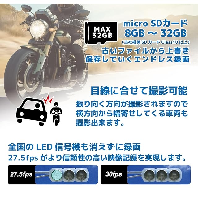 【免責事項】 ■事故映像やナンバーが必ず記録できる事を保証した製品ではありません。不具合などで記録出来なくても保証や一切の責は負いません。 ■夜間の映像は感度不足で写らない場合があります。 ■防水は規格上雨天走行では10分程度が目安になります。 ■両面テープが張れない箇所には利用出来ません。 ■マイクロSDカードは消耗品です。必ず半年から1年で新品交換して下さい。 起動エラー、録画エラーなどSDが原因と思われる症状が起きた場合は必ず新品交換やSD専用フォーマッターでフォーマットをして下さい。PCフォーマットは動作に不具合が出ます。 ■電池性能は徐々に低下致します。予めご理解下さいませ。 ■裏蓋の開け閉めによって湿気が入りますのでレンズの曇りにご注意下さい。 ■結露について: 外気と本体との温度差が大きい時はレンズ内で結露する場合があります。結露した場合は乾燥剤と共に袋に密封し除湿して下さい。 また保管は一般のカメラ製品同様に湿気にご注意下さい。