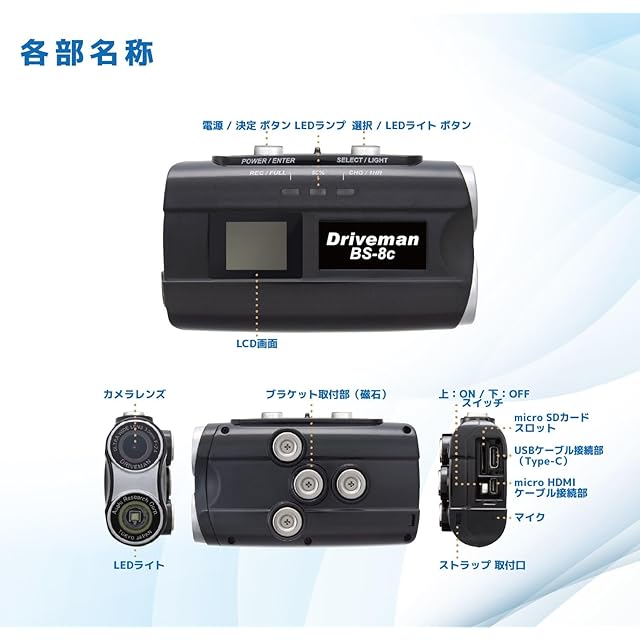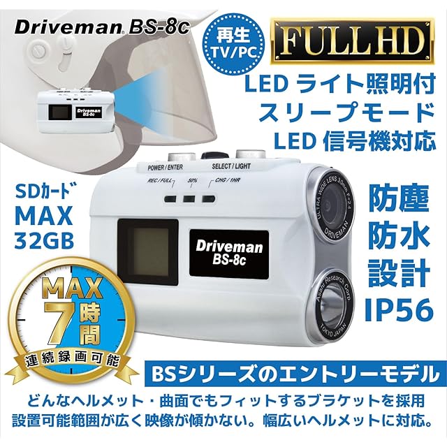 [DRIVEMAN] アサヒリサーチ 警察採用ブランド バイク用ドライブレコーダー BS-8c-B 32GBSD付属セット ヘルメット装着 自転車 ドラレコ FullHD 27.5fps IPX65 ハンドル装着は要OP