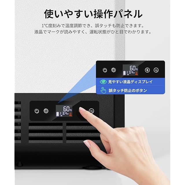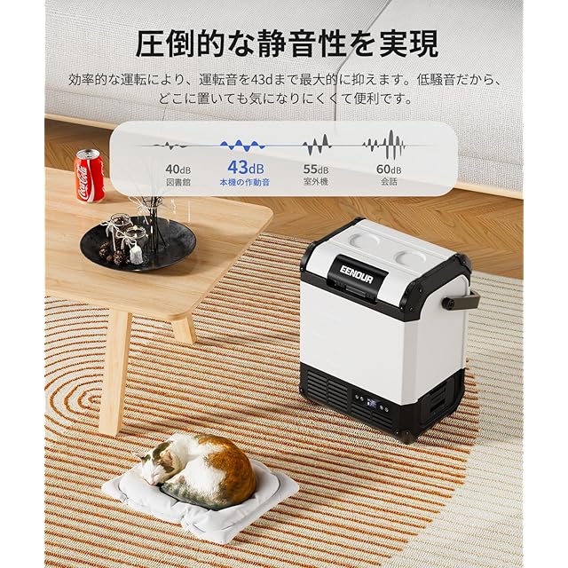 【キャンプを快適にする機能を持つ】①作動音を最大限に43㏈まで軽減して安静な環境を作ります。一室でも安らかに眠ります。②センサーライトが搭載され、真っ暗のアウトドアや停電の部屋でもスムーズに食べ物を取り出せます。③操作パネルが使いやすく、1℃の単位で温度を-20℃から60℃まで設定できます。④蓋の上にカップボルターが二つあり、野外で飲み物も滑りにくくて固定的に置きます。⑤椅子として使え、最大100キロの重みを耐えられます。