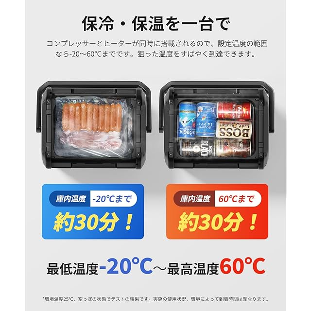 【冷凍・保温の切り替えが可能】-20℃から60℃までの温度を設定でき、暑い季節でも寒い季節でも大活躍です。ペルチェ式より冷却能力が高いコンプレッサー式なので、効率的に庫内を冷やせます。庫内温度が25℃から-20℃までは約30分しかかかりません。ヒーターが内蔵されて庫内温度が25℃から60℃までも約30分だけです。中はアルミニウム製の内胆が採用され、プラスチック製より熱伝達率が高くて熱しやすく冷めやすいです。