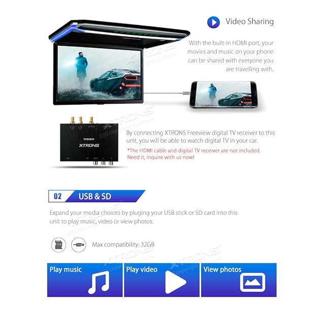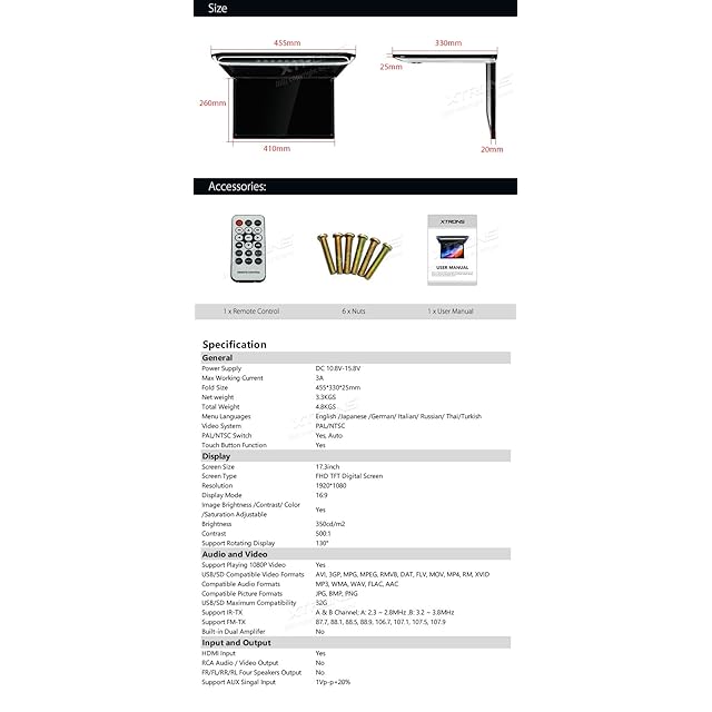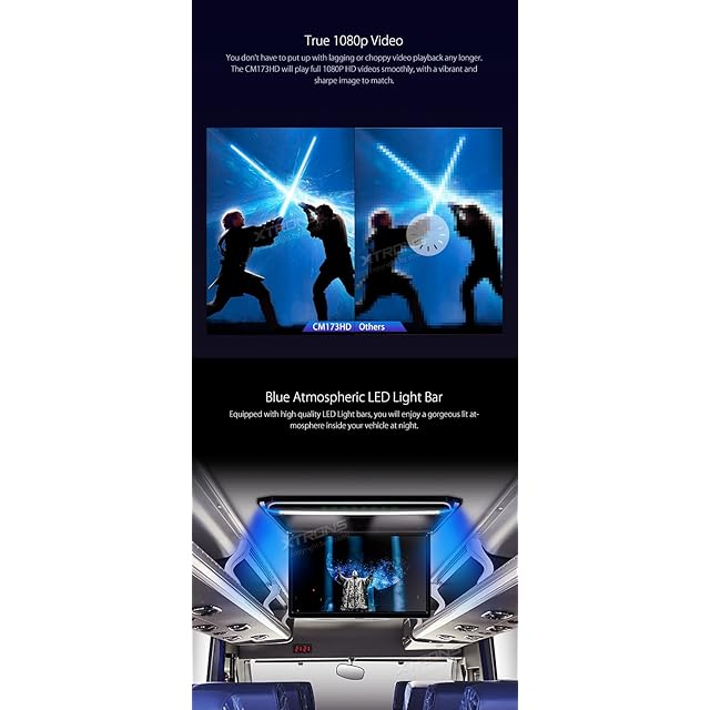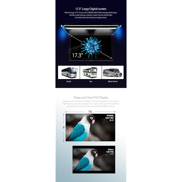 (CM173HD)XTRONS 最新 17.3インチ 大画面 フリップダウンモニター 16:9 FHD 1920x1080 解像度 超薄 HDMI対応 1080Pビデオ対応 外部入力 ドア連動 水平開閉130度 USB・SD