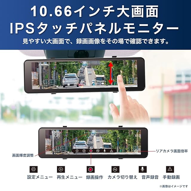 【後付けタイプの簡単取付け】 デジタルバックミラー本体は、10.66インチ液晶のタッチパネル式。純正ミラーにかぶせ、ゴムバンドで固定するタイプのため、車種を問わず簡単に設置することができます。(※1)。 ※1 駐車サポートガイドライン機能をご利用の場合は、別途 リバース連動線の接続が必要です。