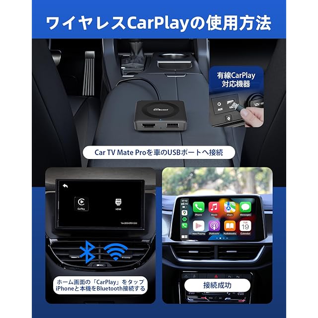 接続や設定が簡単です。有線通信ポートを搭載したCarPlay対応ディスプレイオーディオでfire tv stickをつけて、YouTube等が見れます。テレビキャンセラー取付不要で走行中でもテレビが映せます。また、ワイヤレスCarPlay機能を使うためには、まずはCar TV Mate Proを車のUSBポートへ接続して、そして、ホーム画面の「CarPlay」をタップして、iPhoneと本アダプターをBluetooth接続すると、CarPlayがワイヤレスで使えるようになります。*一部の車両には、電源充電用のポートとデータ転送用のポートが二つあります。データポートを接続してください。