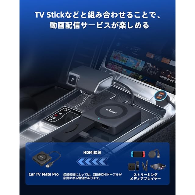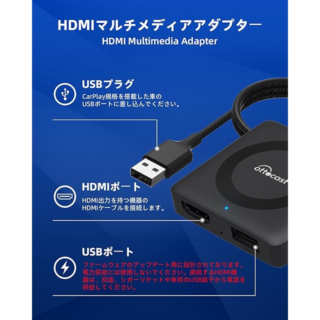 注意事項:本製品単体で動画やテレビを見ることはできません。TV stickなどのストリーミングメディアプレーヤーもしくは地デジチューナーをご用意ください。本アダプターを使用する際には、外部のHDMIデバイスのリモコンまたは他の制御方法を使用する必要があります。また、製品本体のUSB-A端子が充電口ではなくて、ファームウェア更新用です。外部のHDMIデバイスに別途電力供給する必要がございます。本アダプターとHDMI接続で動画配信サービスを視聴する際には、CarPlay機能が使えません。