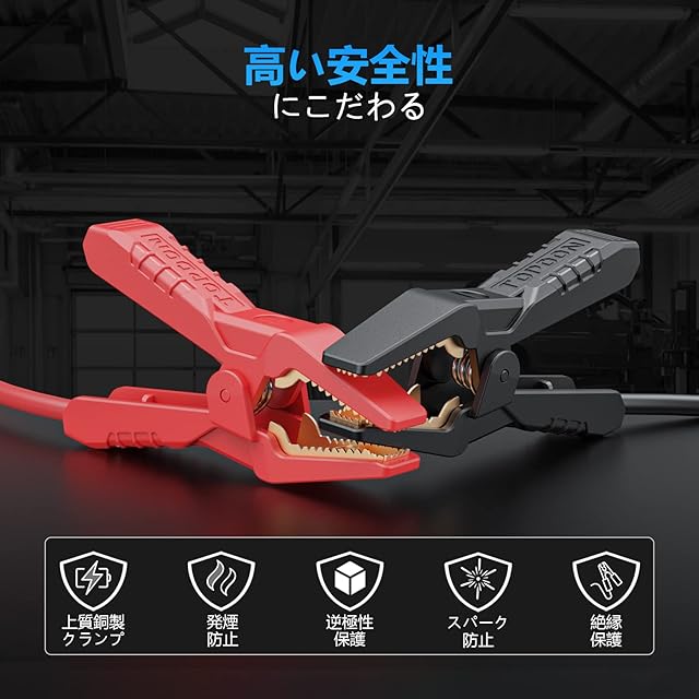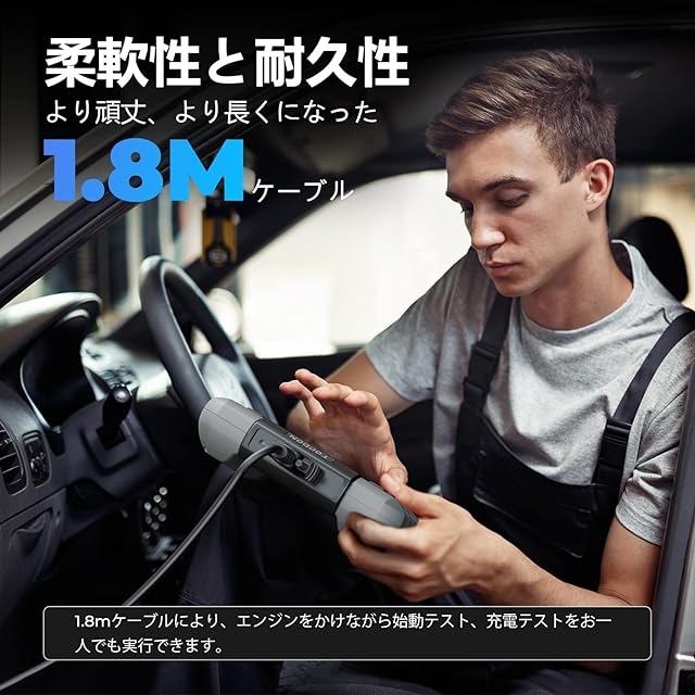 BT600バッテリーテスターには、頑丈な銅製クリップが付属しており、逆極性保護によりバッテリーの損傷を防ぎ、ユーザーと車を常に安全に保ちます。このバッテリーテスターはまた、5.9フィートのコードで、技術者が運転席でもバッテリーと充電のテストを実施できます。この自動バッテリーテスターは、英語、日本語など最大8つの言語を切り替えできます。