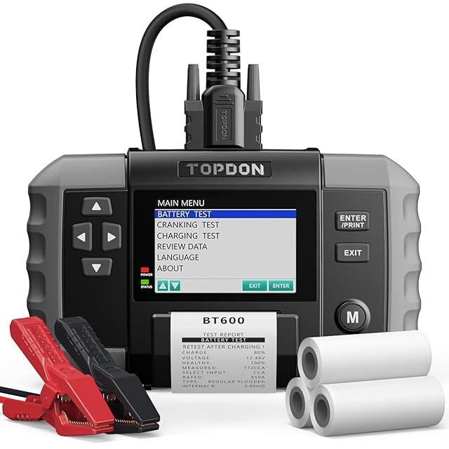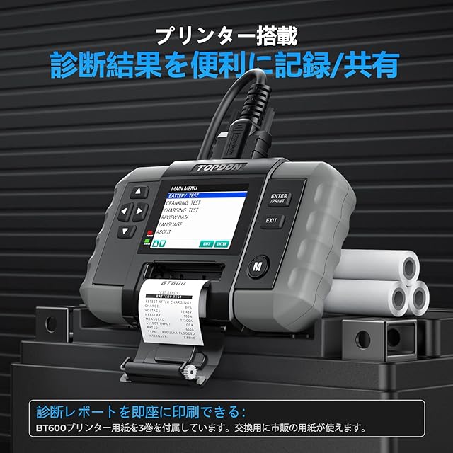 TOPDON バッテリーチェッカー BT600 バッテリーテスター 12V/24V 日本語 100-2000CCA 車 トラック EV車・HV車・アイドリングストップ車対応 バッテリー健康診断 寿命診断 日本語説明書【プリンター付き】