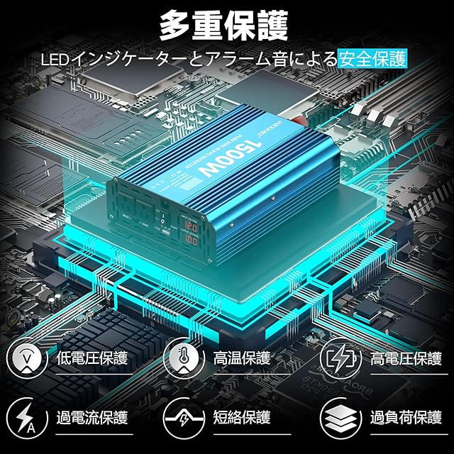 「ディスプレイとLEDで異常をお知らせ」 LCD ディスプレイでインバーターの動作をチェックすることができます。 故障の問題が解決すれば、10秒以内に自動的に復旧し、故障検出機構の感度が高くなります。エラーコードの表示 LO:入力低電圧保護 HI:入力過電圧保護 OH:過熱保護 OL:入力過負荷保護