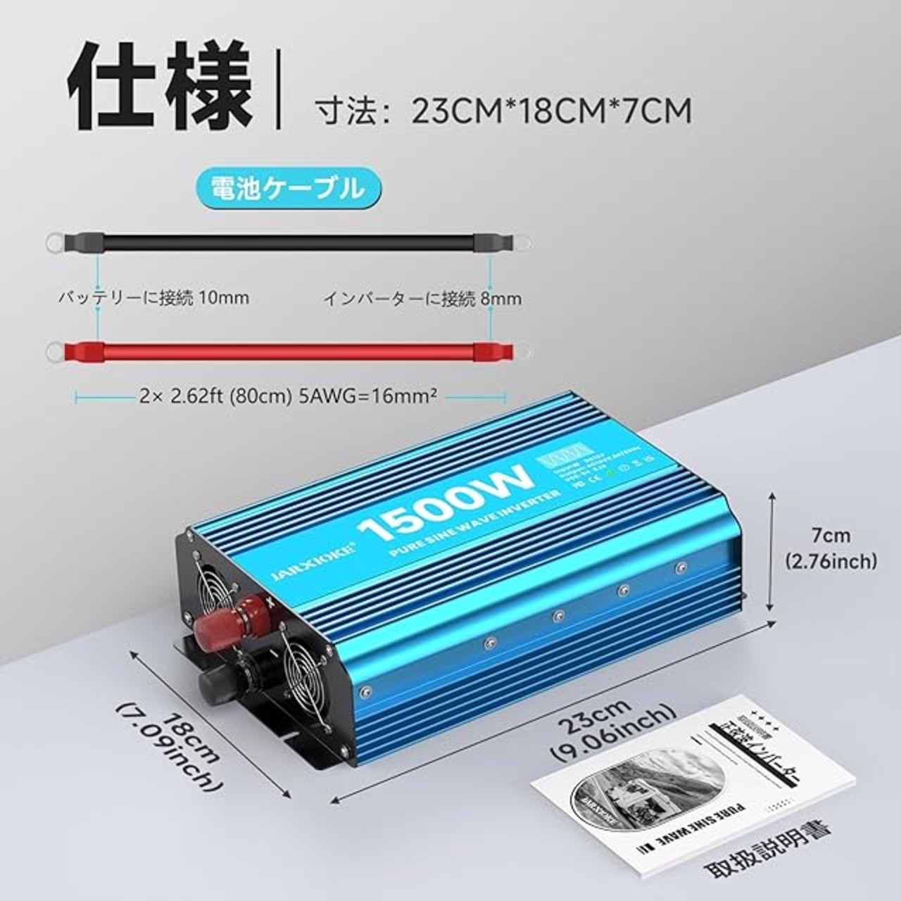 「24ヶ月サービス保証、24時間に対応」12V用 定格出力1500W正弦波インバーター本体、電源ケーブル×2本、日本語取扱説明書、アフターサービス24時間に対応できて、ご不明な点があれば、お気軽にお問い合わせください。