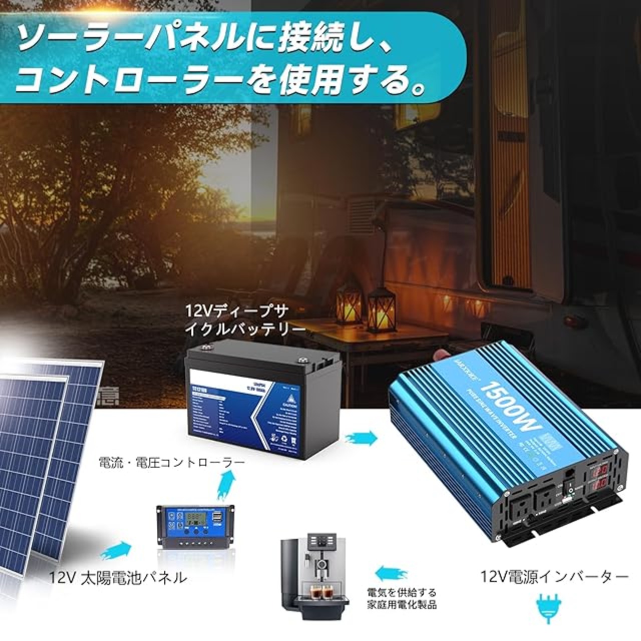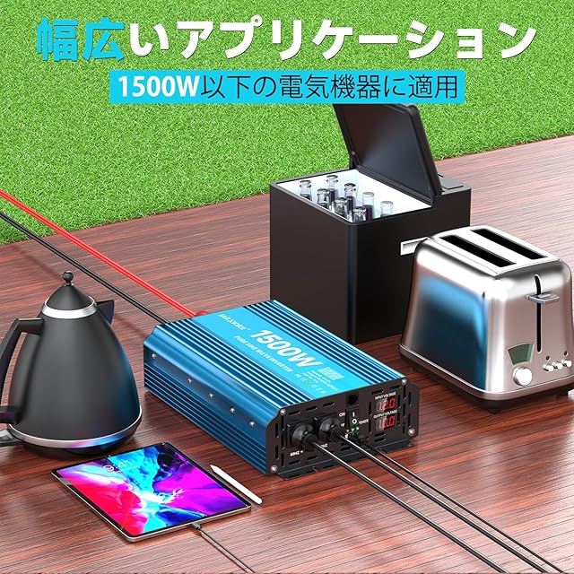 「正弦波インバーター12V 1500W」 本製品は正弦波でバッテリーDC12V直流をAC100V交流に変換し、電子機器に給電可能です。定格出力1500W、2口AC出力コンセント、1口USBポート(5V/2.4A)、 急速充電サポート 同時に複数の端末を同時に充電することもでき非常に便利です。小型ながらもその性能の高さは抜群です。 注意:誘導負荷の電装品はオンした瞬間の消費電力は3-5倍に上昇するため、インバーターは負荷されない可能性があります。