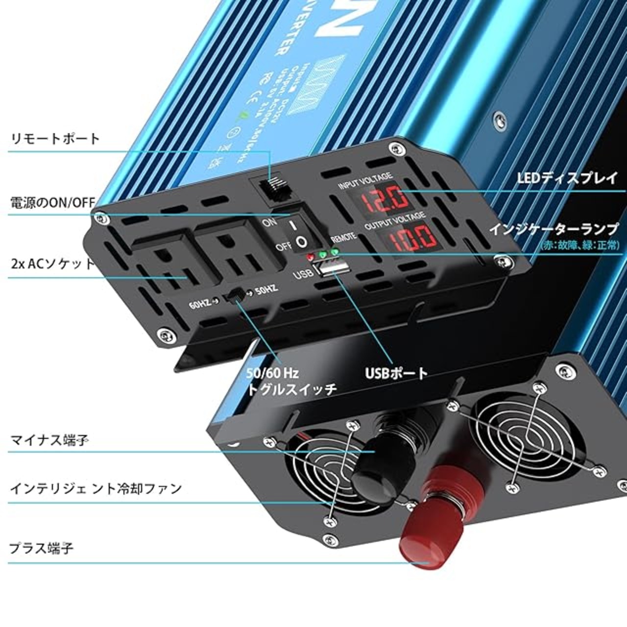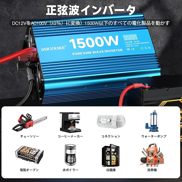 JARXIOKE インバーター 12V 100V 正弦波 1500W DC12VをAC100Vに変換 瞬間出力3000W AC出力コンセント×2 USBポート×1 50Hz/60HZ切替可能 RVキャンペーンカー キャンプ 非常用 太陽光発電 地震停電 防災予備品 車中泊 船