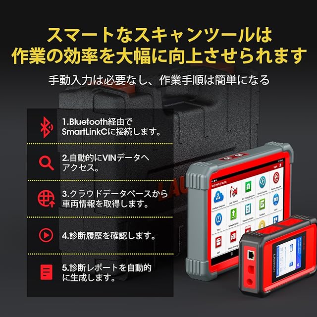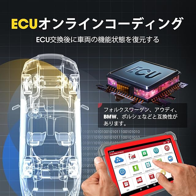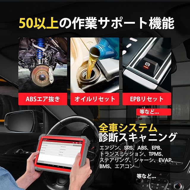 【50以上のリセット機能、全車システム診断】LAUNCH X431 PRO 5は、チェックランプが点灯になった場合、オイルリセット、SAS、EPB、TPMS、イモビライザー、BMS、 DPF、AFSヘッドランプ、ギアボックス、サスペンション、サンルーフリセットなどができます。 また、この自動車スキャンツールは、国産車をはじめ、BMW、メルセデスベンツ、アウディ、フォルクスワーゲン、ポルシェ、フィアット、アルファロメオ、プジョー、シトロエン、ジャガー、ランドローバー、ミニ、キャデラック、ボルボなど、世界中の100以上の人気のある外車メーカーの10000以上の車種にも対応します。