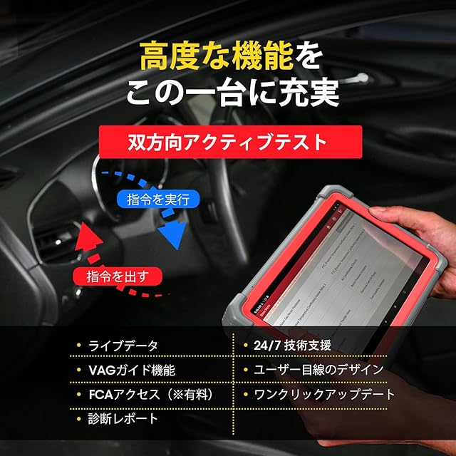 【プロの整備士向けの高度な機能】①オンラインコーディング:VW、アウディ、BMW、ポルシェなどのECU交換後、新しいECUモジュールを照合、再学習、コーディングし、自動車の状態を元に戻す。②アクティブテスト ③AutoScanとAutoVIN(2006以上の車種に適用):車両VINを手動入力手間を省ける。④VAGガイド機能:VAG車の診断において、セキュリティアクセスコードとチャネル番号の入力をスキップできます。⑤24V商用車/トラックの診断にも拡張できます。(ご注意:24V商用車診断ソフトは商品のオンラインモールで購買できます。 )。 ⑥FCA AutoAuth Access:FCAグループの車両に対しては、SGMをバイパスし、車両の診断、アクティブテスト、キャリブレーションなどを実行できます。