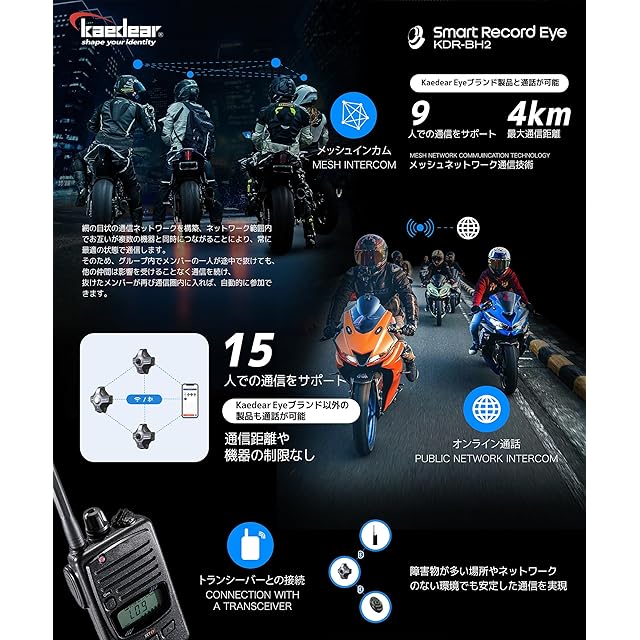 【デュアルモードBluetooth & メッシュインカム搭載】 ①メッシュインカム機能(Bluetooth/最大9台):複数人が自由に参加・離脱可能で、大人数のグループツーリングでも快適な通話を実現。 ②モバイル通信接続(最大15台):アプリを通じてモバイルデータ通信を使用し、距離や障害物の影響を受けずに広範囲で安定通信。 ③トランシーバー接続:Bluetooth対応の外部トランシーバーと接続でき、電波環境の悪い場所でも安定した通話が可能。 ④既存インカムとの連携:Bluetoothで他社インカムに接続し、音楽やナビ音声をお手持ちの機器に出力可能。 ■ノイズキャンセリング:ADSP ■スピーカー:40mm ■最大通信距離:4km ■Bluetooth:デュアルモード(スマートフォン/リモコン/インカム/外部機器) ■他社インカム接続:Bluetooth(1台まで)またはアプリ経由で接続可能