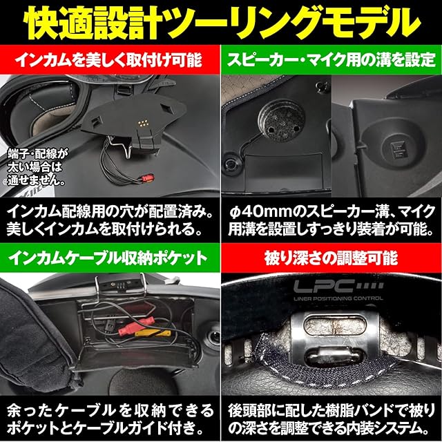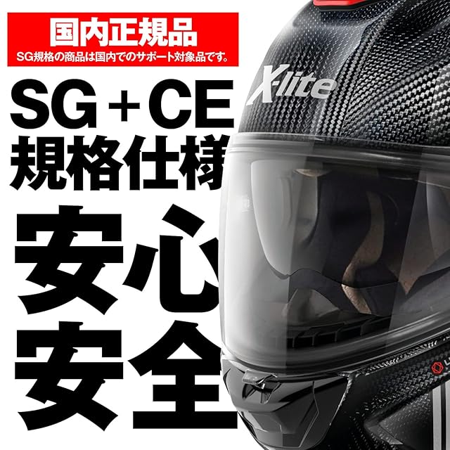 【仕様1】カーボンとコンポジットファイバーをシェルに採用。帽体はSG規格、シールドはECE規格をクリアーしました。ツーリングユースに最適な快適設計モデルです。
