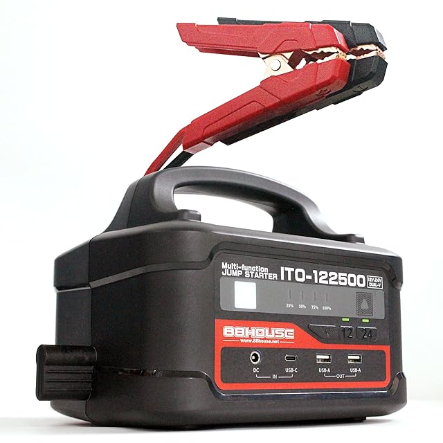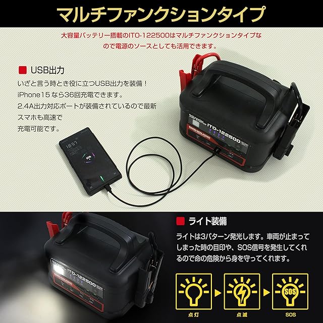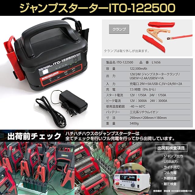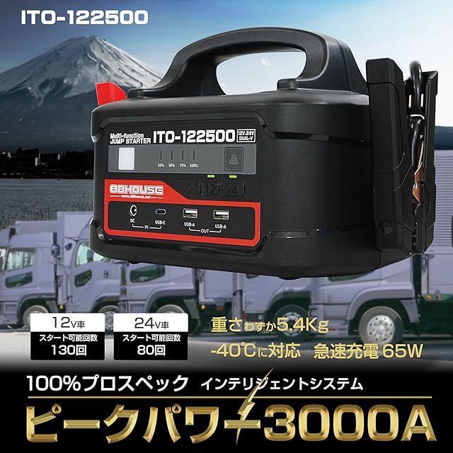 88HOUSE ㈱ハチハチハウス マルチファンクション ジャンプスターター ITO-122500 12V 24V 大容量 122500mAh ガソリン/ディーゼル車対応 メーカー保証1年 ハイブリッド車対応 最大電流 3000A 12/24V 安全保護機能付き 急速充電対応 L1656F