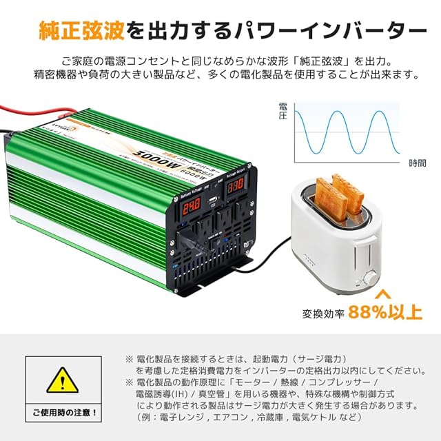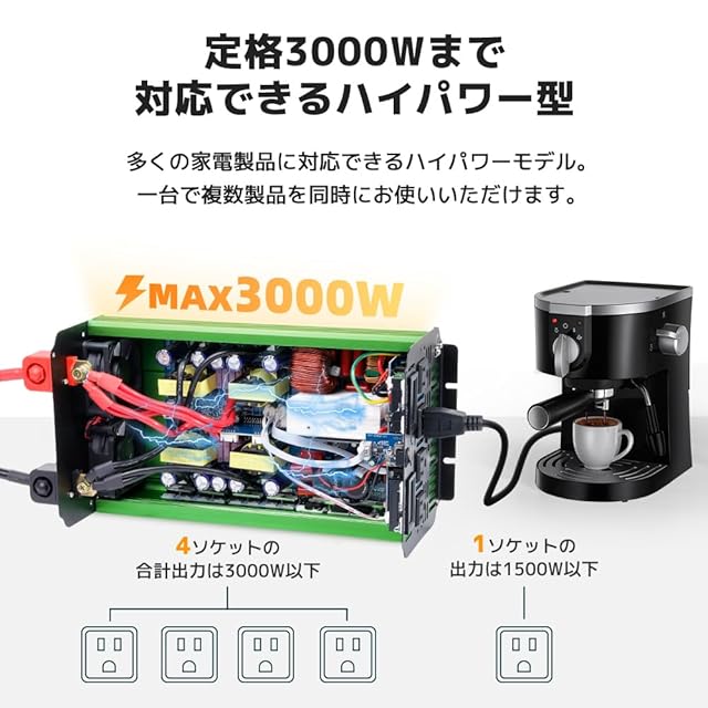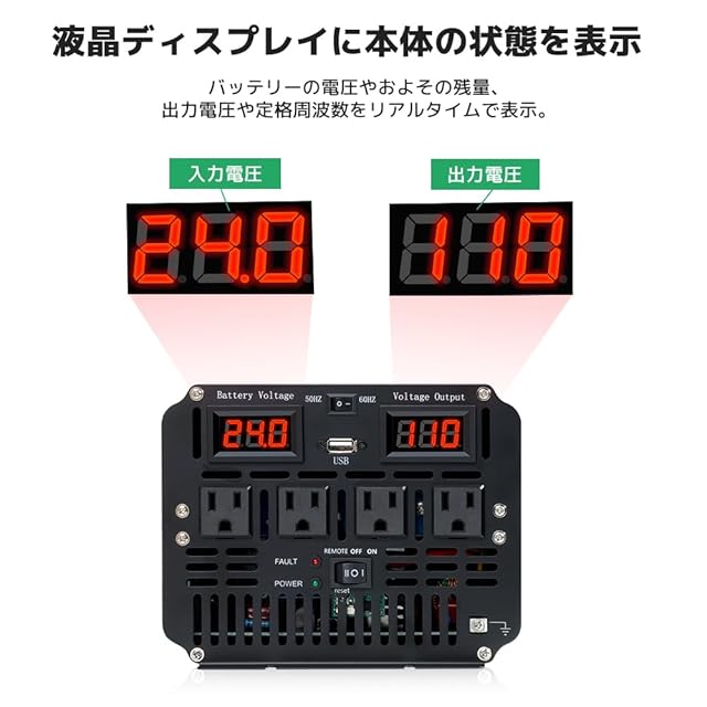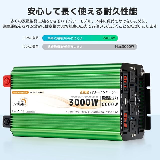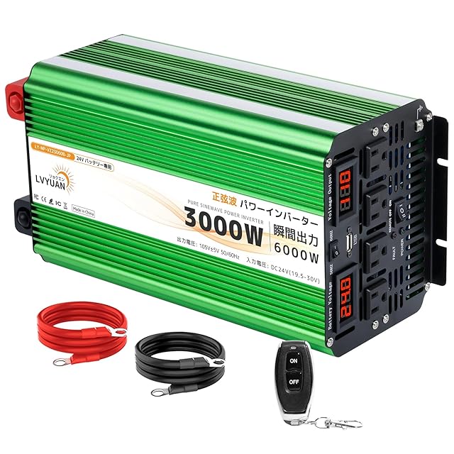 【仕様】入力電圧:DC24V(19.5±1V-30V±1V) 出力電圧:AC105V±5% 定格出力:3000W、瞬間最大出力(1S):6000W、5V/3.1AのUSBソケット×1、ACコンセント×4、出力波形:正弦波。