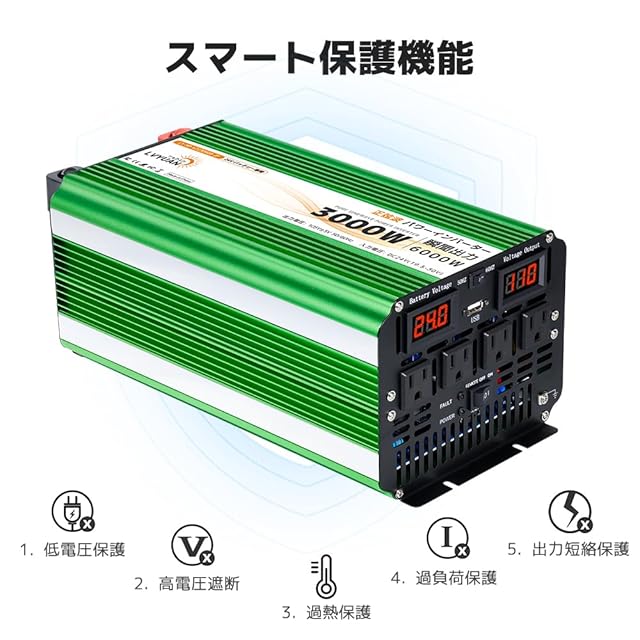 【純正弦波】 LVYUAN 3000W 24Vインバーターは、家庭用AC100Vの出力波形と一致する純正弦波となっております。出力波形が必要とされる正弦波電化製品にご使用いただけます。また、モーターなどの誘導負荷がある電化製品にもご利用いただけます。インバーターは、4つのソケットを備えており、それは家庭の壁コンセントと同様の仕様となっております。各ソケットの出力は1500Wでございまして、4つのソケットの合計出力は3000Wです。バッテリー端子には絶縁保護カバーが装備されており、ご使用時の安全性を高めております。※ご使用に際しては、電化製品の電力にご注意くださいませ。1500W以上の電化製品をご使用する必要がある場合には、当社のUPS低周波インバータまたはハイブリッドソーラーインバータをお選びいただけますようお願い申し上げます。