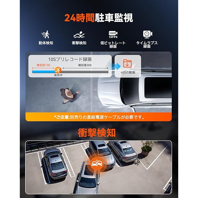 【4モード駐車監視&動体検知エリア調整&駐車低照度暗視】別売の直結電源ケーブル(B094882TJC、B0B7NGCTGQ)と組み合わせることで4つの駐車監視モード(動体検知、タイムラプス録画(省容量)、衝撃検知(低消費電力)、低ビットレート録画(省容量))が可能に。動体検知モードは10秒プリレコード録画にも対応、検知前10秒から検知後30秒までの映像を自動保存。思わぬ瞬間も確実に記録。 状況に応じて検知エリアを調整できる先進の動体検知エリア調整をサポート。歩行者や葉の揺れ、街灯の明滅、天候の変化による誤動作を抑え、サンデードライバーのマイカーも長時間見守り続けます。加えて【駐車低照度暗視機能】を新たに追加。高性能レンズとタッグで暗視性能を大幅にアップしています。