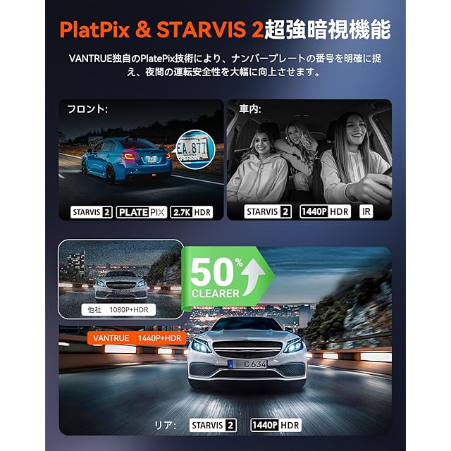 【PlatePix技術&STARVIS 2&HDR暗視機能強化】Vantrue独自開発「PlatePix」技術搭載、ナンバープレート認識強化版のフロントカメラが、悪天候や高速走行時でもナンバープレートを確実に捉えます。さらに、全カメラに革新のIMX675 STARVIS 2センサーとHDR技術を融合させた次世代暗視システムを採用。驚異的な感光性能でノイズやブレを大幅に低減し、暗闇、豪雨、夜間といった過酷な環境やトンネルの急な明暗変化や夜間の低照度環境でも、前後・車内の映像を鮮明に記録。明るい場所と暗い場所が混在する環境でも、ナンバープレートを含む細部を捉え、確かな証拠を残します。更に、車内カメラには赤外線LEDライトを4つ装備され、夜間走行時に暗い車内も、ドライバーの顔が分かる明るさで車内監視を実現します。