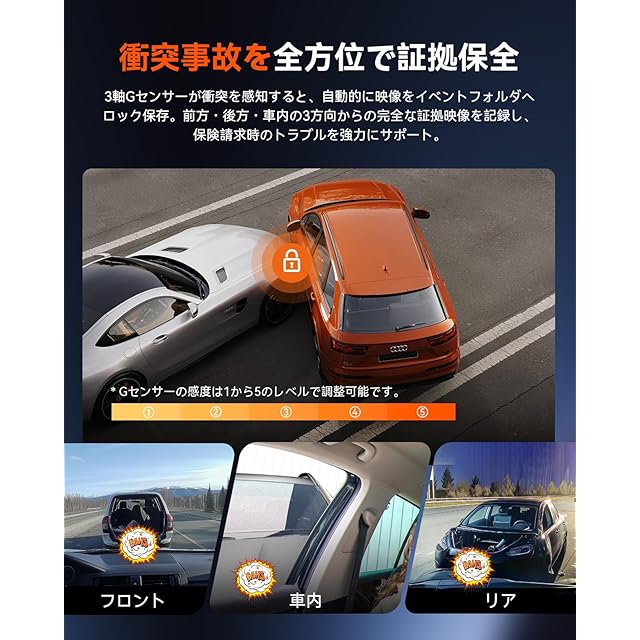 【3軸G-センサー&ループ録画】 3軸Gセンサーが衝突や急減速を検知すると、自動で緊急録画を開始。事故発生の前後数秒間の映像をロック保存するため、原因調査や保険請求時の重要な証拠として活用できます。上書き機能により、メモリーカードがいっぱいになると古い動画から順に新しい動画を自動で上書きします。手動で削除する必要がなく、容量不足による撮れ漏れの心配もありません。最大1TBのSDカード(別売り)をサポート。