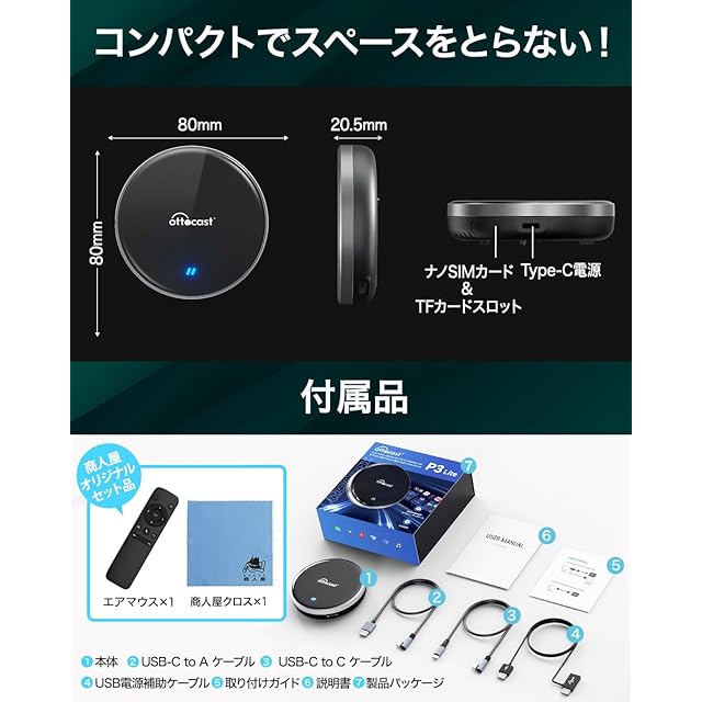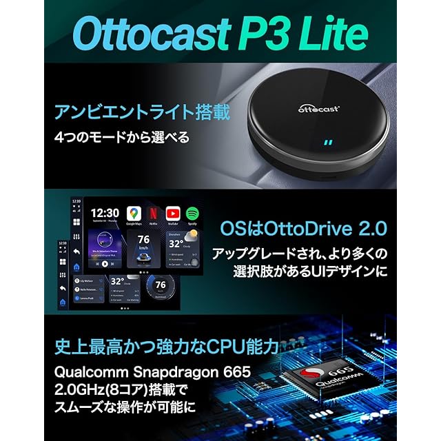 【国内正規代理店】オットキャスト P3 Lite OTTOCAST P3 Lite carplay ai box カープレイドングル 有線接続のみの純正CarPlayをワイヤレス化 無線化 android 12.0モデル ワイヤレス CarPlay Android Auto両対応 動画視聴可能 エアマウス付き