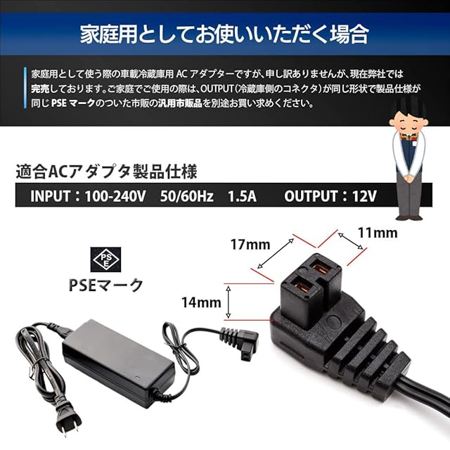 【追記】家庭用としてお使いいただく場合は、OUTPUT(冷蔵庫側のコネクタ)が同じ形状で製品仕様が同じPSEマークのついた汎用市販品を別途お買い求めくださいませ。詳しくは、当ページ内の「家庭用としてお使いいただく場合」の画像をごらんください。弊社では現在、お取り扱いしておりません。