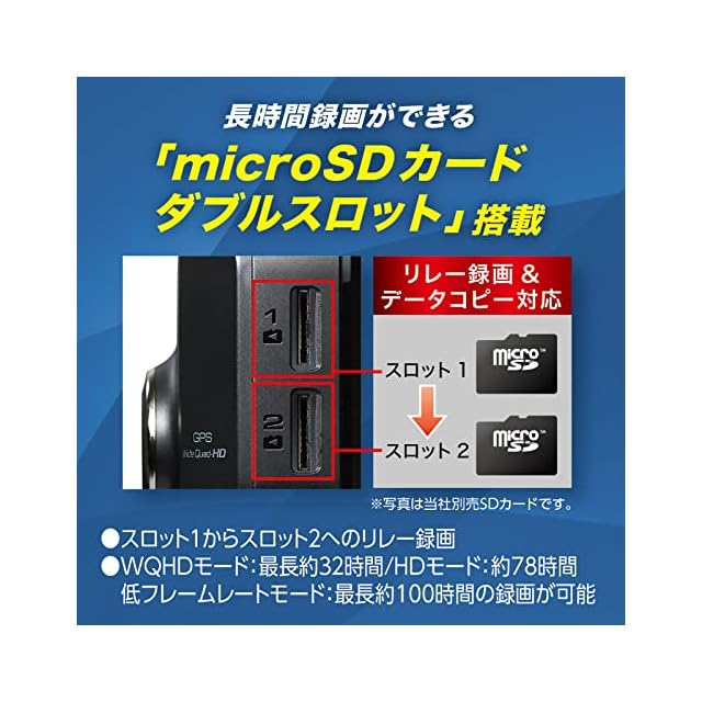 12V対応。最大約100時間録画に対応する「microSDカードダブルスロット」を搭載。車載電源ケーブル「CA-DR100」(別売)を使用することにより、24時間365日の駐車録画に対応。