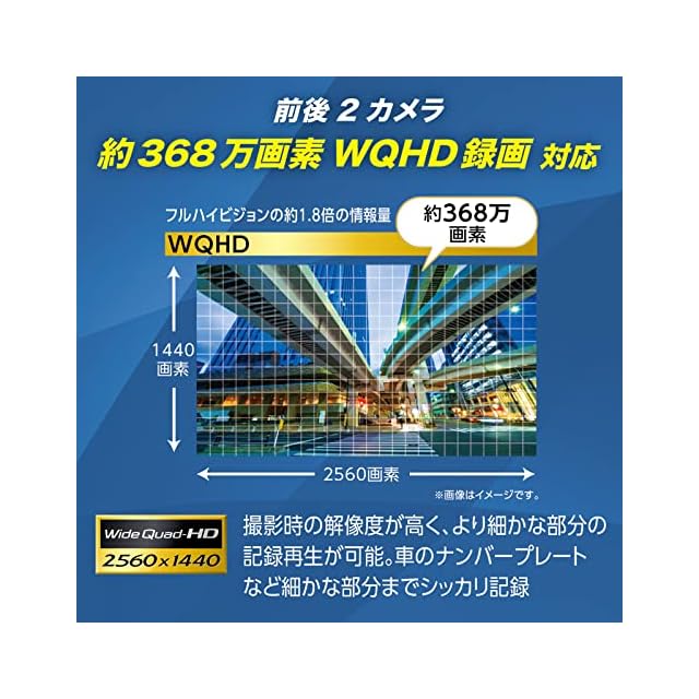フロント・リアの両カメラにF1.6の明るいレンズと、約500万画素のCMOSセンサー「STARVIS」を搭載し、暗い環境でもノイズの少ない高感度録画と、フルハイビジョンの約1.8倍の解像度となるWQHDでの高画質録画を実現