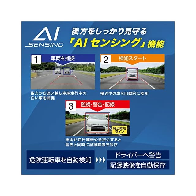 後方からの急接近や蛇行運転などのあおり運転を自動で検知する「AIセンシング」をはじめとする運転支援機能を搭載
