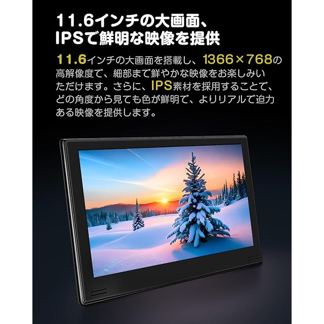 【11.6インチの大画面、IPSで鮮明な映像を提供】11.6インチの大画面を搭載し、1366×768の高解像度で、細部まで鮮やかな映像をお楽しみいただけます。さらに、IPS素材を採用することで、どの角度から見ても色が鮮明で、よりリアルで迫力ある映像を提供します。