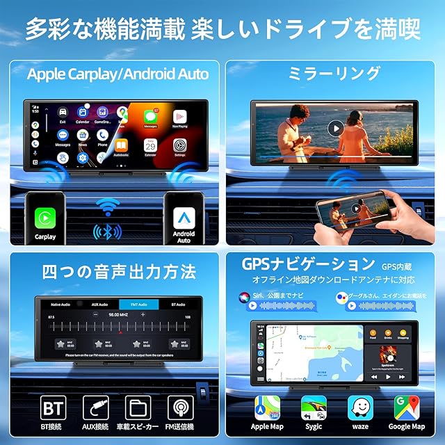 多彩な機能満載 楽しいドライブを満喫: さらに、カーステレオのスピーカーにオーディオのBluetooth伝送を使用することができ、ロスレス車のオーディオ体験を達成し、FMワイヤレス伝送オーディオとAUX出力オーディオもサポートされています。 11.3 "ワイヤレスcarplayスクリーンは、IOSとAndroid携帯電話のミラーリングをサポートし、12400 * 540Pのカータッチスクリーンを装備しています。長距離旅行や渋滞時にミラー映画を見たり、YoutubeやTIKTOKビデオなどを簡単に同期したり、ハイビジョン大画面のビデオ体験を楽しむのに適しています。ご注意:※一部の動画配信アプリでは著作権保護によりミラーリングには対応できない場合がございます。あらかじめご了承く