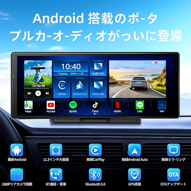 アンドロイド搭載の最新ポータブルカーオーディオが登場しました!8コアCPU + 4GB RAM + 64GB ROM 追加ストレージ容量 いつもと違うドライブ体験を:最新のAndroidシステムにより、Wi-Fiに接続している時はいつでも本製品に最新のアプリをインストールすることができます。11.3インチの車載ディスプレイでYouTube、Netflix、Prime Videoの動画を楽しめます。 8コアCPUの高速実行パワーと4GB RAM + 64GB ROMの大容量で、一味違うドライビング体験をお楽しみください。ご注意:ストレージ容量が不足するとアプリが正常に動作しない場合がありますので、不要なアプリやデータは定期的に削除して容量を確保してください。