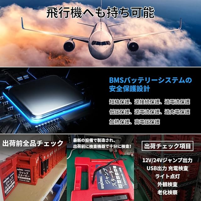 安全保護機能付き!短絡、過電流、逆電流、逆接続、低電圧、過放電など誤操作を行ってしまった際、短絡・過負荷を検知すると機器本体の電源が自動で切れるので、事故を防止して貴方の車を守ってます。日本規格のPSE検査、CE,FCC,ROHSなど世界基準の様々な安全規格、品質テストに合格しています。