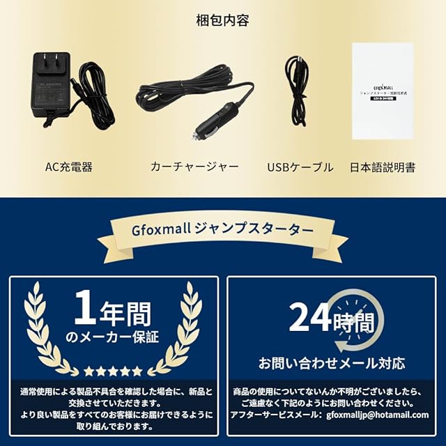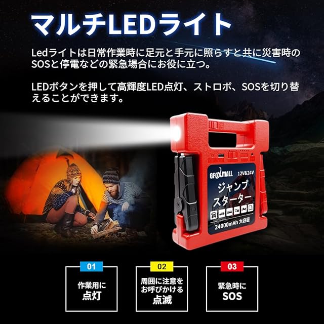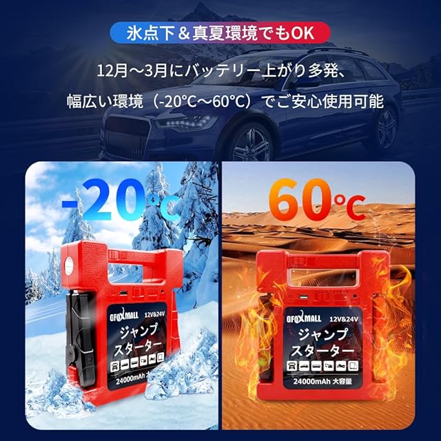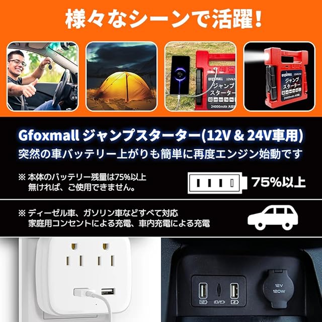 Gfoxmall ジャンプスターター 12v/24v ガソリン/ディーゼル車対応 24000mAh エンジンスターター バイク 防水 夜間作業や緊急時照明 パワーパック ツール 安全保護機能付き日本語説明書付属