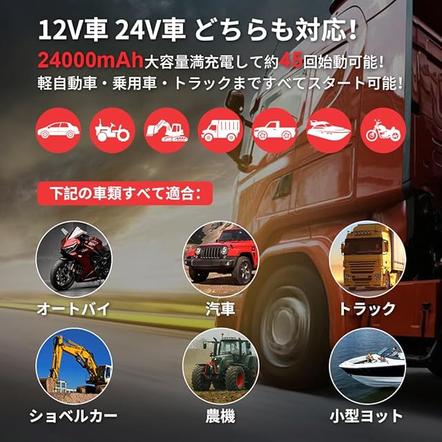 ピーク電流1200Aで12V車(450A-600A) 24V車(600A-1200A) どちらも対応!軽自動車・乗用車・トラックまですべてスタート可能!大容量24000mahバッテリー搭載、20トロ以上重さの車も起動でき、普通乗用車からトラックまで幅広く活用できます!